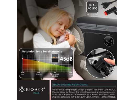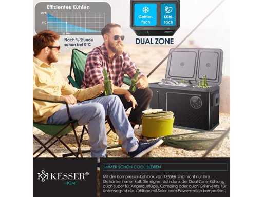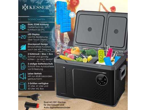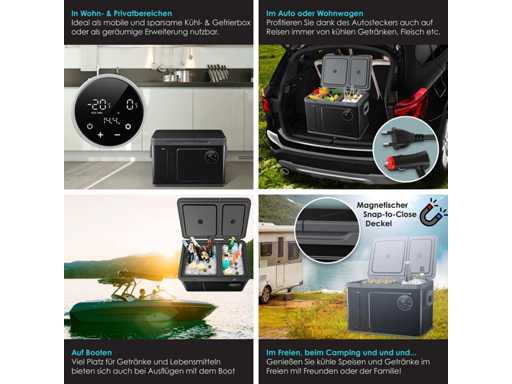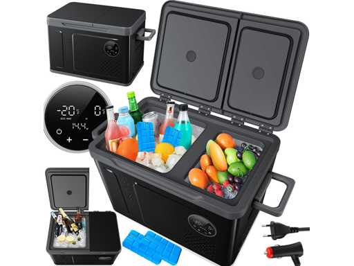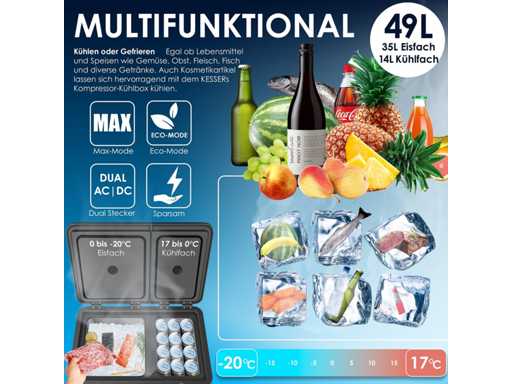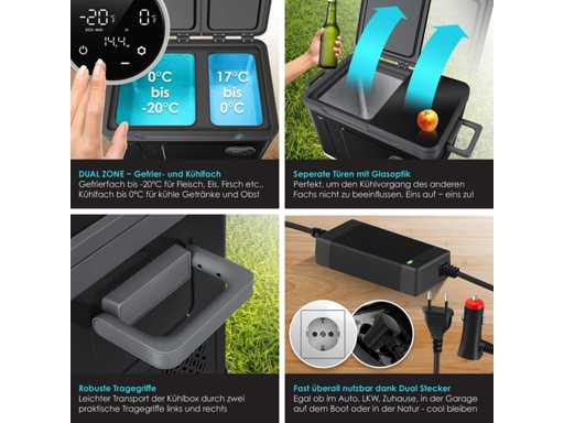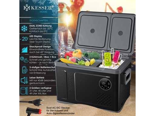 - Two-zone cooling with freezer compartment down to -20°C and refrigerator compartment down to 0°C. - User-friendly operation via LED display and touchscreen - Impact-resistant design for perfect operation even on 45° slopes - Max and Eco cooling modes for fast or efficient cooling - 3-level battery protection for reliable chiller operation - Particularly quiet operation with 45dB - Available in three sizes: XXL box of 31 liters, 40 liters and 49 liters - Two AC/DC outlets for use on wall outlets and in the car - Separate doors with glass optics so as not to disturb the cooling process of the other compartment - Heavy-duty carry handles for easy transport - Reaches a temperature of 0°C in 30 minutes - Ideal for fishing trips, camping, residential and private areas, boats, and barbecues - Compatible with solar power or power plants - Quick-close magnetic lid for safe storage Variant 49 liters - Total content: 49 liters - Freezer compartment capacity: 35 liters - Refrigerator compartment capacity: 14 liters - Max. Refrigerator compartment temperature: 0°C - Max. Freezer Compartment Temperature: -20°C - Number of Cooling Modes: 2 / Max + Eco - Operating volume: 45dB - Dimensions: 384 mm x 616 mm x 537 mm (LxWxH) - Freezer compartment dimensions: 294 mm x 272 mm x 425 mm (LxWxH) - Refrigerator compartment dimensions: 288 mm x 181 mm x 264 mm (LxWxH) - Power cord length: 215 cm -Car Plug Length: 250cm - Weight: 15.8 kg