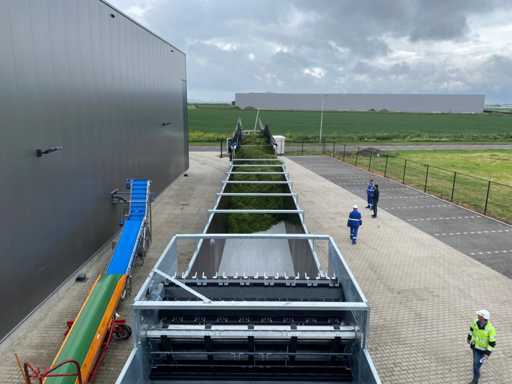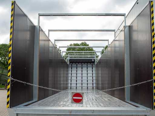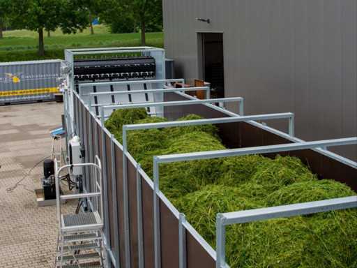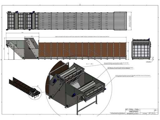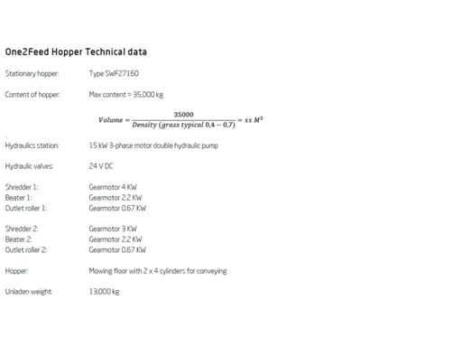 One2Feed SWF 27170, Length Moving Floor 16.850 mm, Max loading 35.000 kg, Moving Floor, 27 fiber profiles, Hydraulic unit for Moving Floor, Shredder one in 60 days. with, 5 x 75 mm traction rubberbelts, Drums for equal distribution, Shredder two in 45 dg. With, 5 x 75 mm traction rubber belts, Drums for equal distribution, Control cabinet with, Inverter control for shredder, Inverter control for drum, 7" touch screen for operating, Site manager for secure remote access, Weighing system with output, Data communication via Profinet