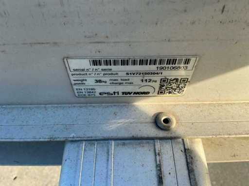 Equipped with: Aluminium roof rack for Iveco Daily, with own weight approx. 38 kg, maximum load 112 kg, provided with type/serial number 190109923 (product no. S1V72150304/1), TÜV/ESTL-certified according to EN 12195, EN 12642 and ECE R73, equipped with several sleepers and side rails, suitable for professional transport use. Incl stainless steel steps.