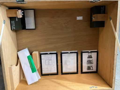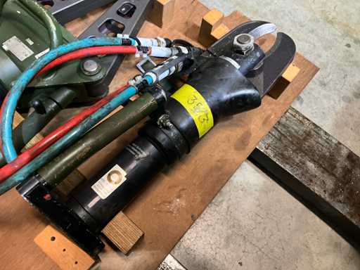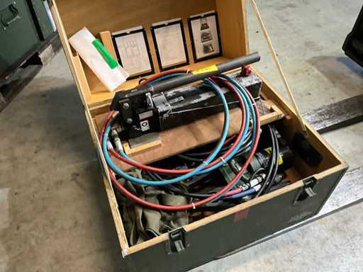 Set consists of hydraulic high-pressure hand pump, spreader, scissors and various accessories; in wooden storage box; Photo is indicative, content may vary slightly