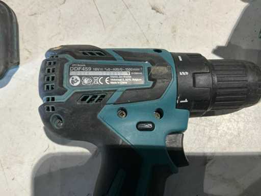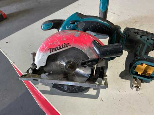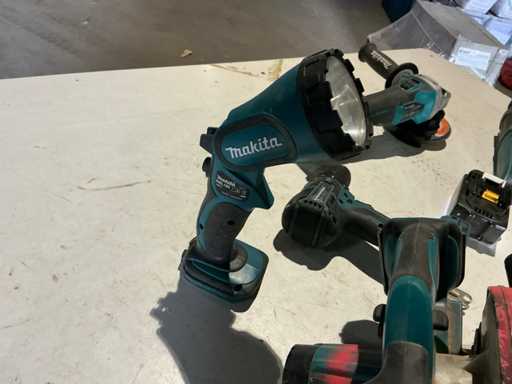 1x BHR202 impact drill; 1x DGA506 angle grinder, Ø125mm, s/n 043581K; 1x DDF459 screwdriver, s/n 170819Y; 1x BML185 Carrying Light; 1x DSS611 circular saw, s/n 1373016Y; in total with 1x 18V battery, without charger