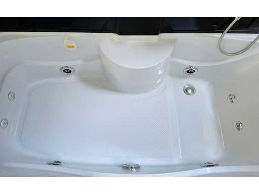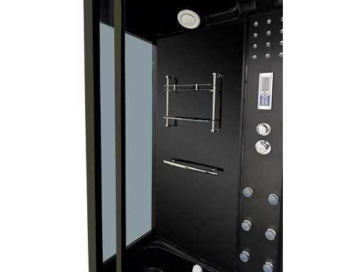 Type: LR8035 Model: Steam cabin with massage bath - Rectangular Dimension: 1700x900x2200mm Color: Black cabin with white bath Number of jets: The cabin has water jets that provide a pleasant back massage Equipped with:- Colored safety glass which provides extra safety in the steam cabin. Thanks to the safety glass, you never have to worry about shards on the floor because it is impact-resistant and strong. If it does happen that the glass cracks, it will break up into blurry pieces.- Equipped with 2 sliding doors- Top lighting- Mood lighting - Fan - Hand shower - Top shower - Function for a pleasant foot massage - Towel rack with shelf - Soap and shampoo dispenser - Aroma therapy: fill the aroma holder with your favorite aromas such as the well-known eucalyptus to spread delicious scents during steaming - Cabin stands on adjustable legs that are easy to adjust in height
