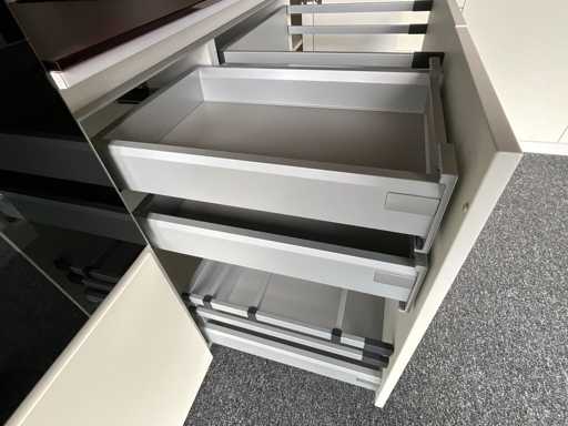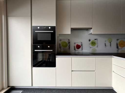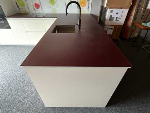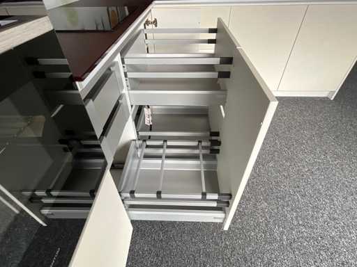 Dimensions left part approximately 361x60x244 cm; dimensions right part approximately 244x97x90 cm; Already disassembled and packed on pallets. (stacking, exchange or deposit per pallet); Pallets are not included; pay a deposit when picking up, or stack pallets; worktop not packed on pallets