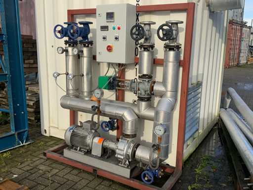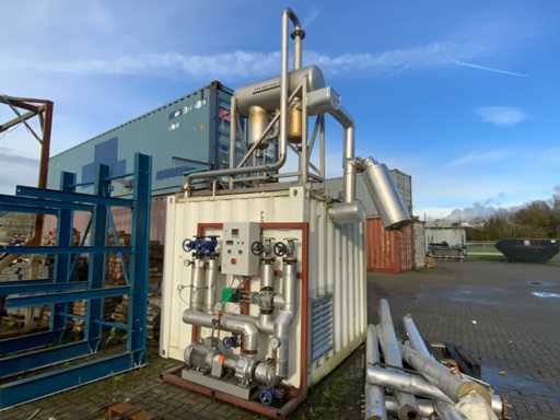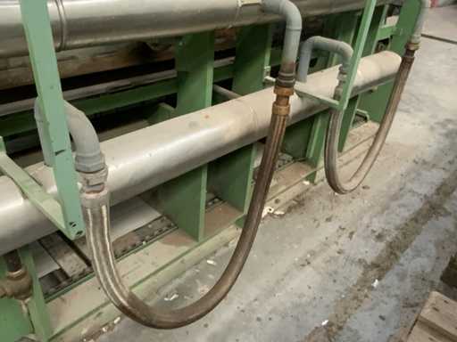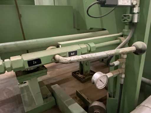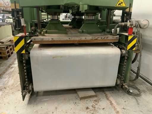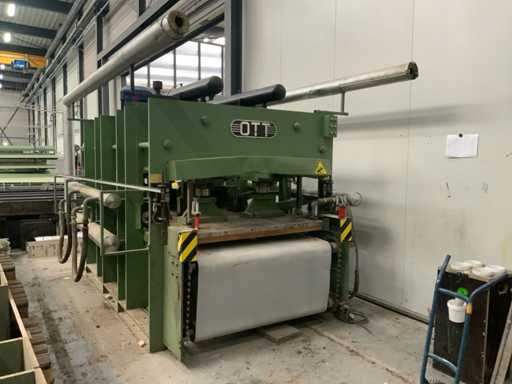 Robuuste industriële hydraulische warmpers voor het verlijmen en persen van fineer, panelen, deuren of multiplex-elementen. * Maximale persdruk: ca. 90 ton * Verwarming: olie- of elektrische verwarming via geïntegreerde platen * max werkstuk hoogte 150mm * vermogen 11Kw * inclusief besturing / pompkast (reeds gedemonteerd maar werkend weggezet) afmeting circa 320x240x460cm (hoogte is demontabel tot circa 235cm) * diverse documentatie aanwezig