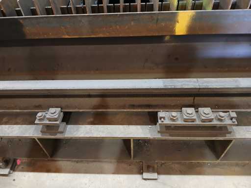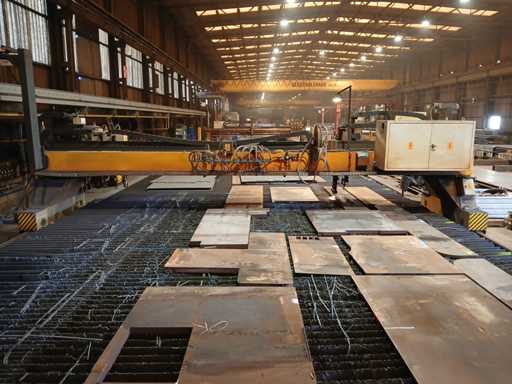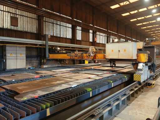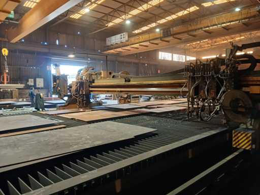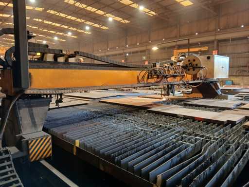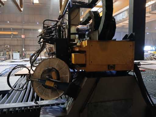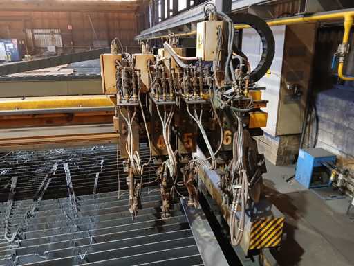 ESAB Numorex NXB 7500 industriële zuurstofsnijmachine met hoge capaciteit, uitgerust met 6 snijkoppen. Robuuste machine, geschikt voor het snijden van grote diktes en tot nu toe in productie gebruikt. Nog steeds in gebruik tijdens de inspectie.