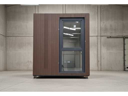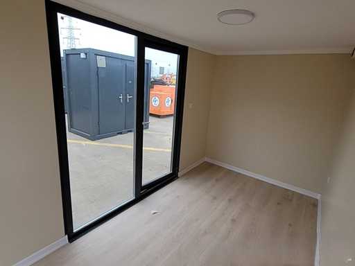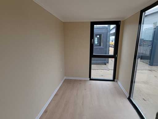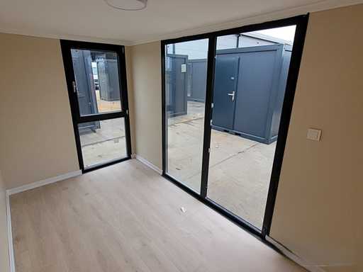 Houtcomposiet gevelbekleding; Interieur, 50mm geïsoleerde wanden, vloer & dak; Vloer, laminaatparket; Wanden, gepleisterd & geschilderd; Plafond, gepleisterd & gipsplaat; Ramen, Deceuninck