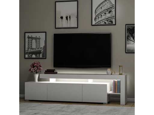 Productbeschrijving: Tv-meubel van 18 mm dikke melamine, witte afwerking. Het heeft LED-verlichting en drie deuren. Hij is 192 cm breed, 53 cm hoog en 37 cm diep. De tv-plank is 162 cm breed, 53 cm hoog en 35 cm diep. Het product wordt geleverd in een uniek pakket van 35 kg.