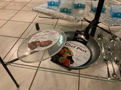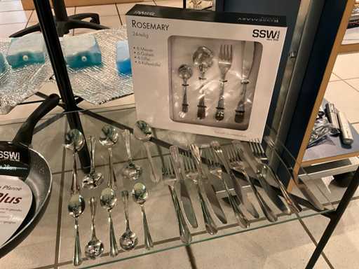 3delig inox kookpotset Ssw, braadpan met antispatdeksel en 24 delig inox bestek