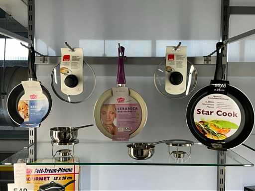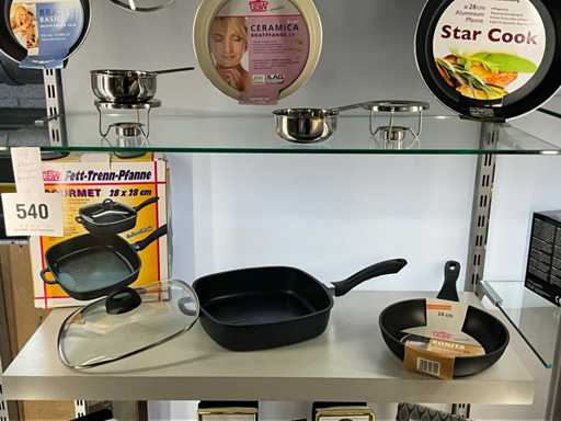 Waaronder 4 braadpannen antikleef met verschillende diameters, 1 x vierkante sauteerpan met deksel 28 x 28 cm,2 x glazen deksel , 2x steelpannetje met verwarmer