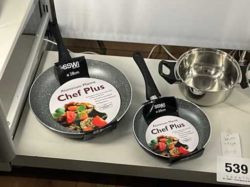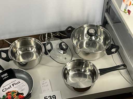 Waaronder 2x braadpan in diverse diameters, 3xkookpot inox met deksel, 1 x steelpan inox
