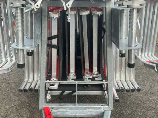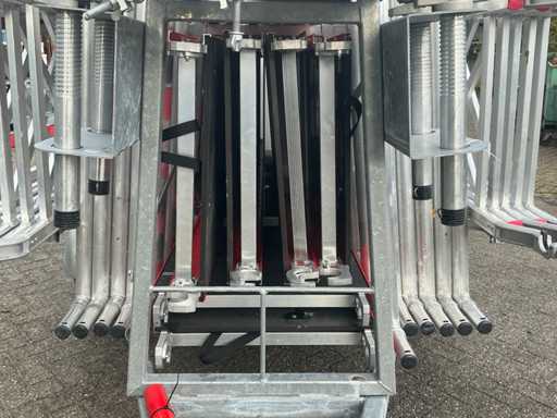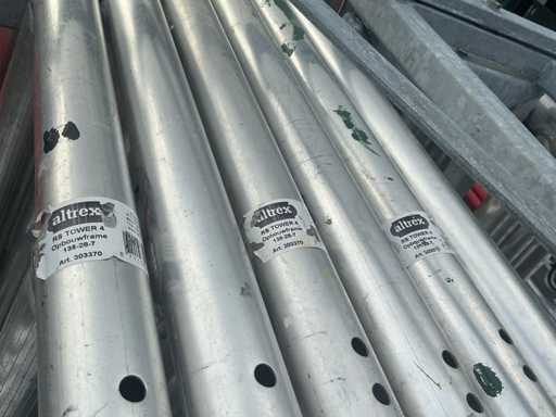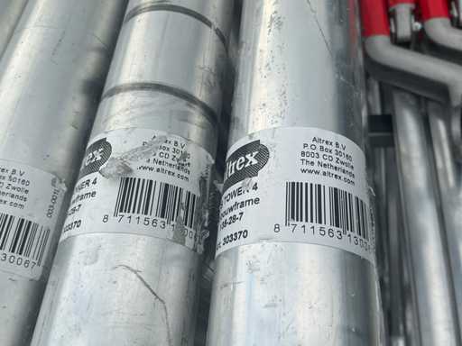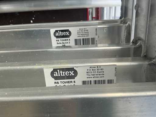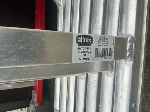 Altrex RS tower 4, 6 platformen, 4 wielen, 11 RS tower 4 opbouwframes, 4x stabilisator stang, 12x Safe Quick 2 RS tower 5. 12 meter hoog totaal.