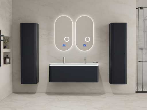 Type: BOSTON1202-BL. Afmetingen Complete set: 1 * Wastafelmeubel - 1200x455x400mm, 1 * Dubbele wasbak - 1205x460x190mm, 2 * Zijkast - 1500x350x350mm, 2* Spiegel- 450x900mm. Voorzien van: LED verlichting in onderkast - 2 kranen inclusief pop-up afvoer – 1 lade met 2 opbergvakken - Softclose lade systeem - LED spiegels met anti-fog systeem - Voorgemonteerde zijkasten en wastafelmeubel.