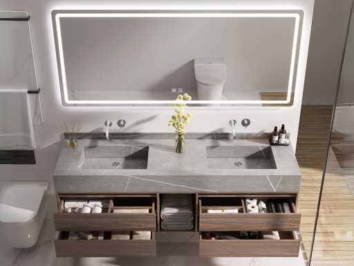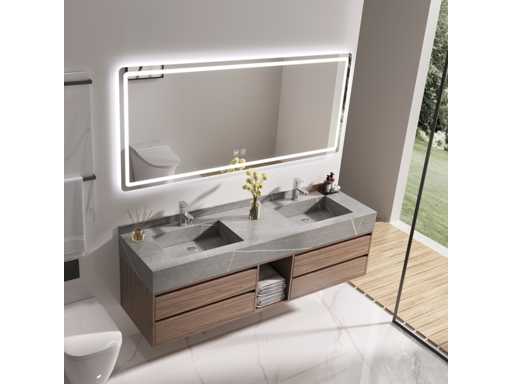 Type: MBY-415. Afmeting: 2-persoons set: 1 * Wastafelmeubel - 1500x550x550mm, 1 * Spiegel - ca. 1500x700mm. Voorzien van: Softclose lade systeem: 4 lades - Kranen inclusief pop-up drain - Spiegel met touchscreen LED-verlichting en anti-fog technologie - Voorgemonteerd wastafelmeubel.