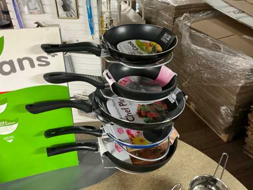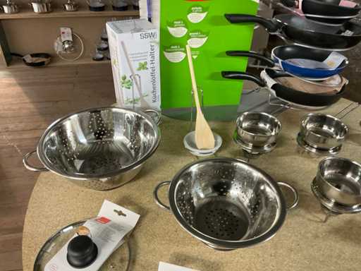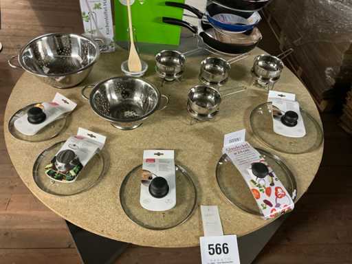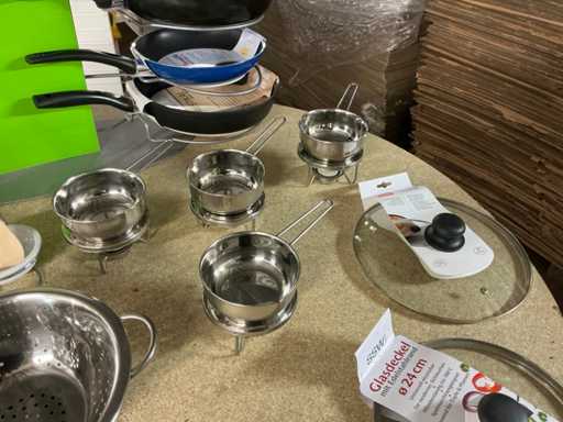 Waaronder 2x vergiet, diverse maten 4 sauspotjes met warmer, 5x deksel, 5x braadpan met 5 x passend glazen klokdeksel