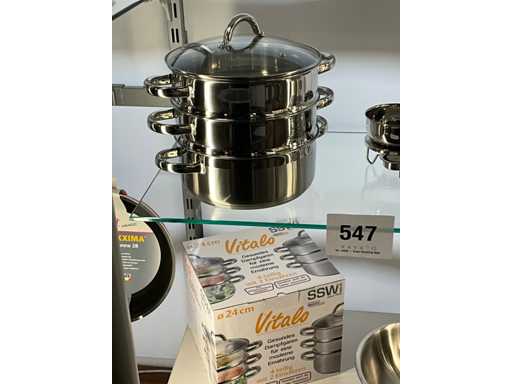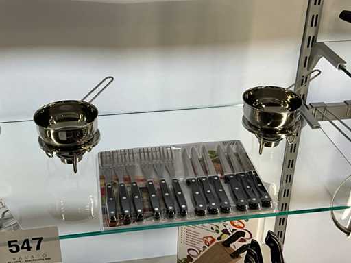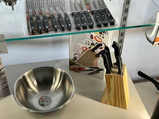Waaronder stoompot 4 delig , 12 delig steakset voor 6 personen, mengkom,8 delig messenblok, 2 x sauspannetje met warmer