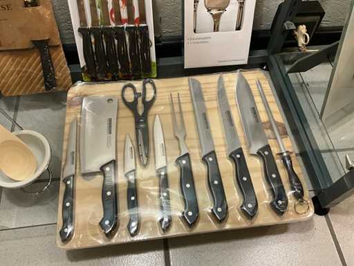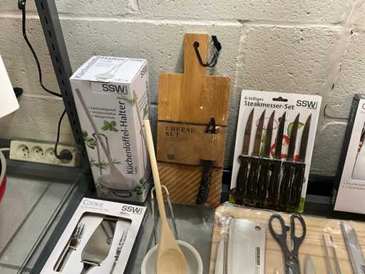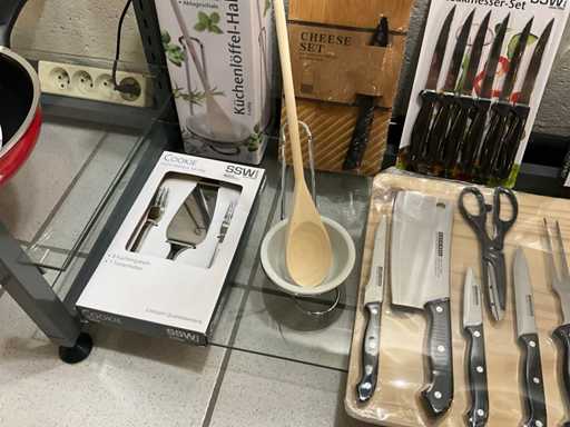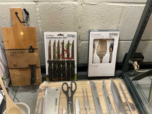 Waaronder proffesionele 11 delige messenset met snijplank en wetstaal, 2 X 9 delig taartset voor 8 personen, divers bestek, steakmessenset, kaasset en andere keukenbenodigdheden