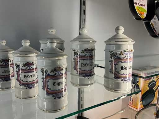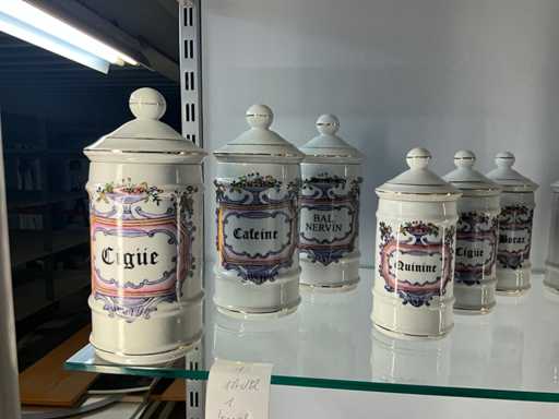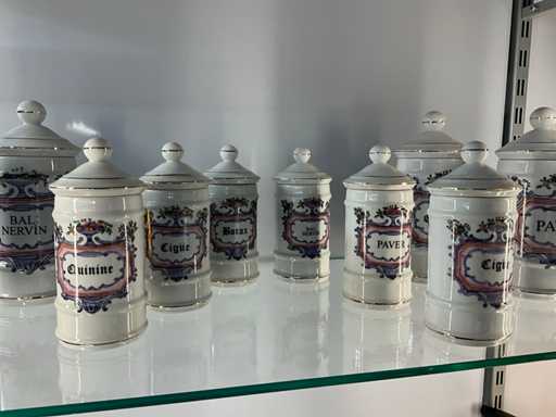 Diverse antieke apotheekpotten (12x) met opschrift