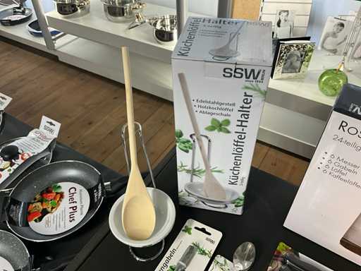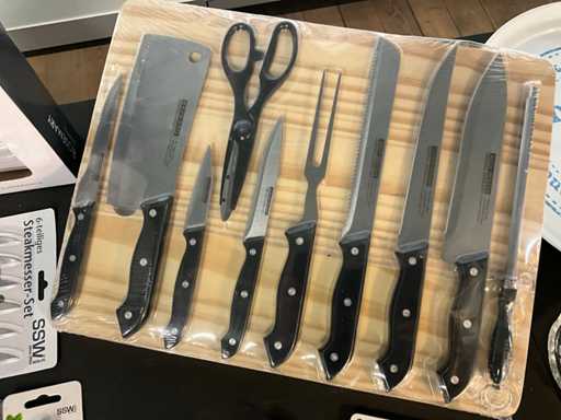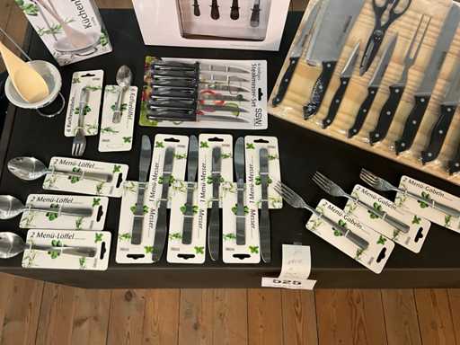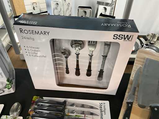 Waaronder GSW en SSW waaronder 30 delig bestek inox voor 6 personen, 24 delig bestek inox rosemary voor 6 personen,steakmessenset voor 6 personen, proffesionele koksmessen met snijplank en wetstaal 11 delig , keukenlepelhouder met spatel