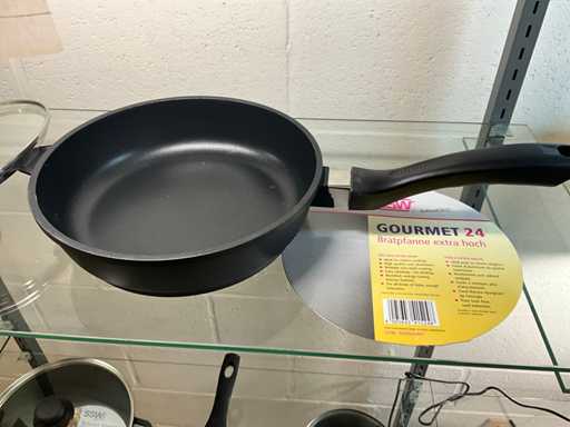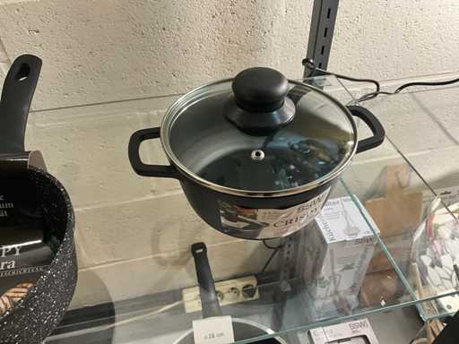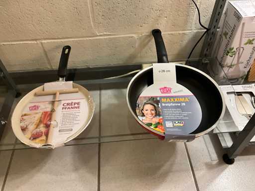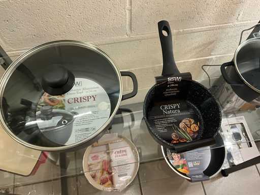 Waaronder 2 x kookpot 16+24 cm met deksel,steelpan 16 cm, flensjespan met verdeler, braadpan 28 cm , sauteerpan 24 cm met deksel
