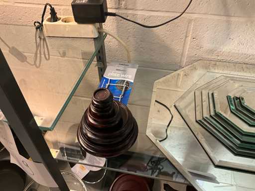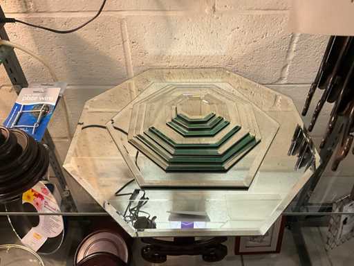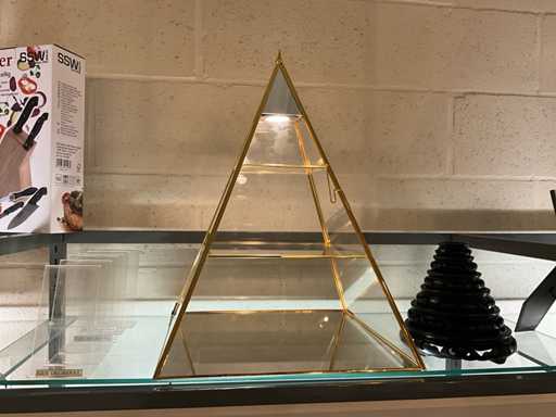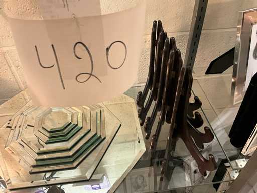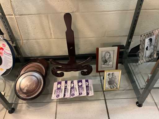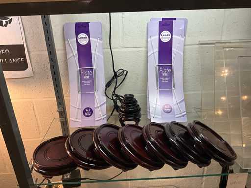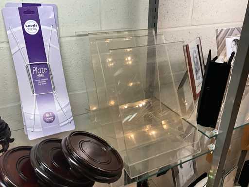 Waaronder vitrine pyramide met licht , Diverse bordenhangers, houten sokkels, spiegel onderleggers, spiegelplateau s, fotokaders, bordenstaanders...