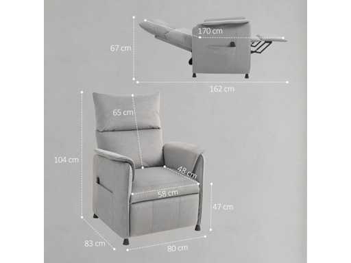 Specificaties: - Kleur: Grijs - Materiaal: fluweel (100% polyester), schuimvulling, staal - Totale afmetingen: 80B x 83D x 104H cm (recht) - Totale afmetingen: 80B x 162D x 67H cm (hellend) - Zitafmetingen: 58B x 48D x 47H cm - Rugleuningafmetingen: 66B x 65W cm cm - Rugleuningdikte: 18 cm - Armleuninghoogte: 67 cm - Afstand vanaf de muur: 50 cm (hellend) - Aanbevolen maximale belasting: 135 kg - Ingang: 100-240V, 50-60Hz - Uitgang: 29V, 1A, 29W - Koordlengte: 2 m