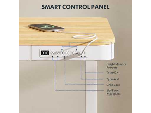 Ingebouwde meerdere functies: Sla eenvoudig meerdere instellingen op met vier programmeerbare vooraf ingestelde hoogtes. Laad twee apparaten tegelijk op via de ingebouwde USB-poorten, zonder rommel of gedoe. (Opmerking: Het opladen kan worden onderbroken bij het aanpassen van de hoogte van het bureau. Het opladen van een laptop wordt ook ondersteund.)