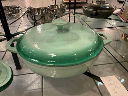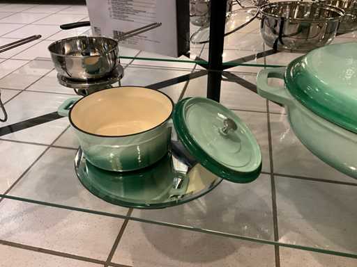2x gietijzerne potten geemailleerdbinnen in diverse diameters compleet met 2x sauspannejtes met warmer