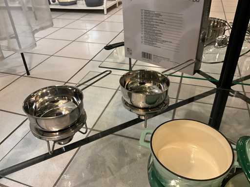 Gietijzeren kookpotten (2x) en 2 inox sauspannetjes met warmer
