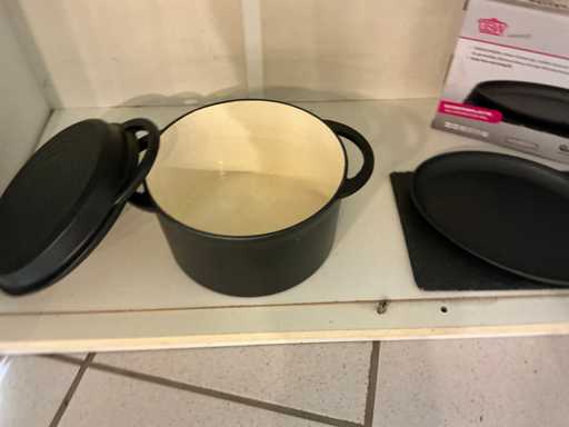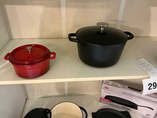 Gietijzeren kookpotten en gietijzeren serveerpan met onderlegger (5x)