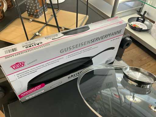 gietijzeren wok , gietijzeren serveerpan,inox sauskommetjes met warmer