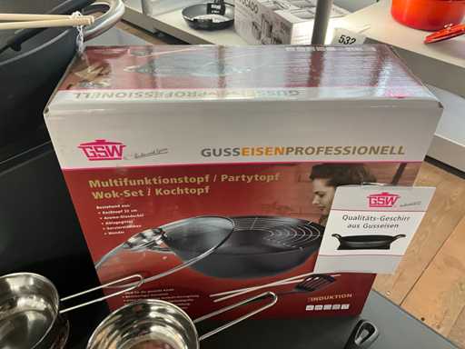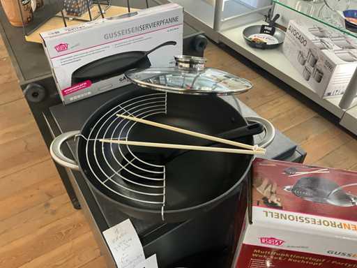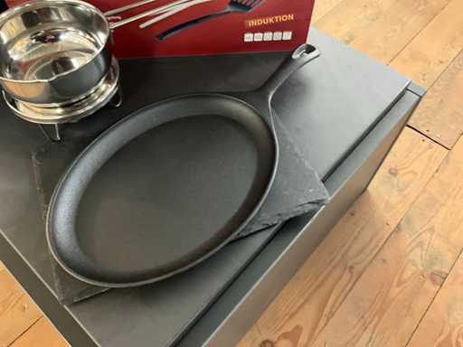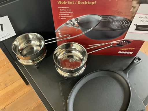 Waaronder 2 diverse sauskommetjes met verwarmer, gietijzeren wok met deksel , warmhoudrek en toeberhoren, gietzijeren serveerpan met onderzetter in leisteen