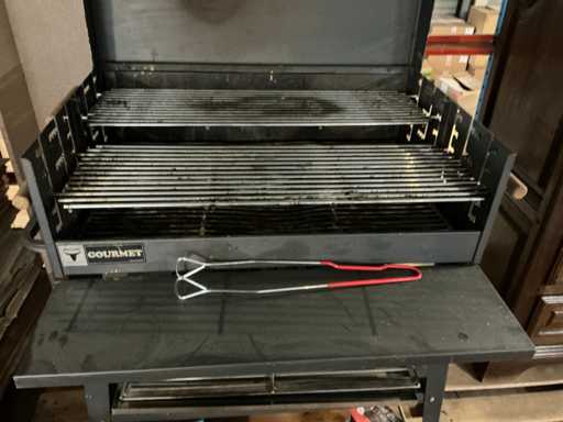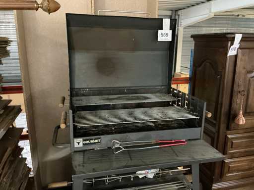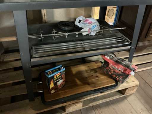 Met toebehoren en aanmaakstaafjes en houtskool, spit en verschillende roosters