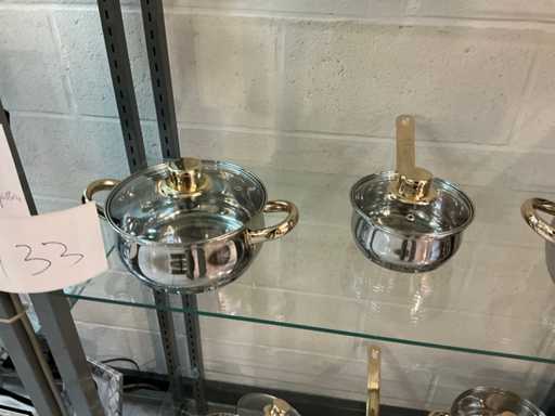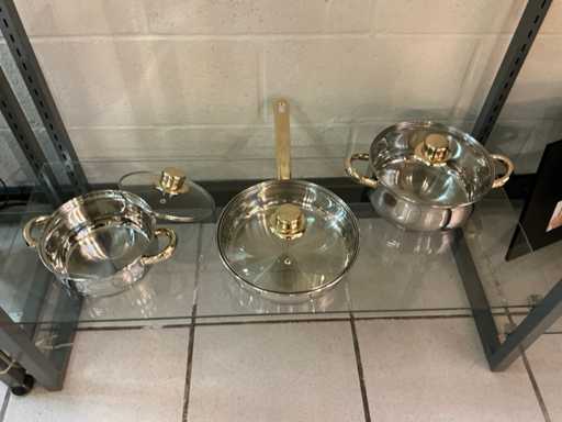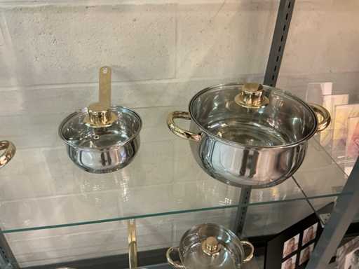 4 x kookpot in diverse matten met deksel, 1 x braadpan 24 cm met deksel, 1 x steelpan 16 cm met deksel