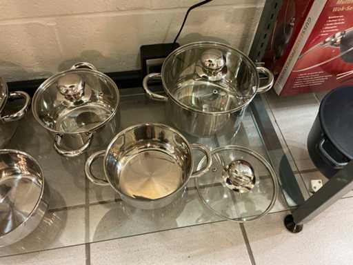 4 x kookpot diverse diameters met glazen deksel en steelpan inox