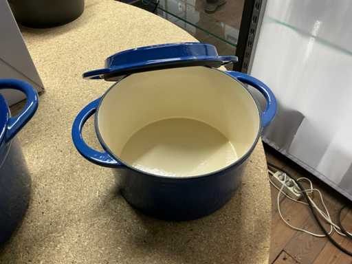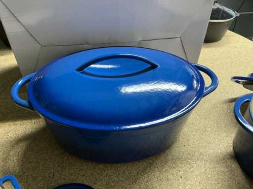 3 x gietijzerenkookpot waaronder 1 x ovale kookpot met deksel en 2 x ronde kookpot med deksel met geemailleerde binnenzijde kleur blauw