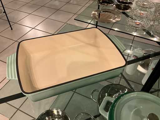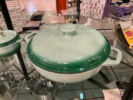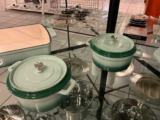 1 x gietijzeren braadslee, 1 x gietijzeren sauteuse met deksel, 2 x gietijzeren kookpot met deksel - allen ook geemailleerd aan binnenzijde