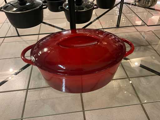 4 gietijzeren kookpotten met deksel en geemailleerde binnenkant rood waaronder 3 ronde en 1 grote ovale kookpot