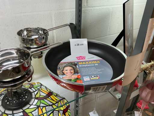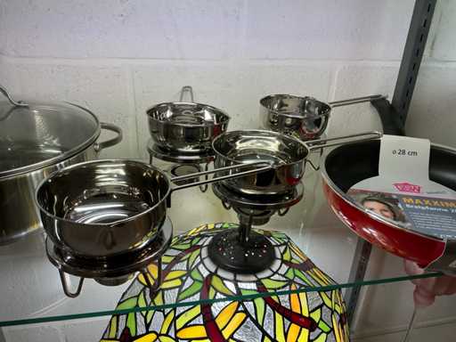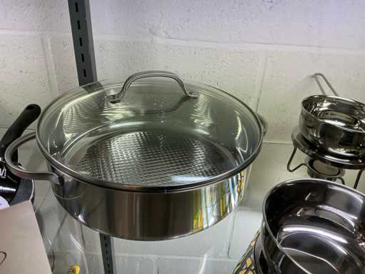 Waaronder 4x sauspotje inox met verwarmer,1x braadpan en 1 x ronde kookpot 28 cm met wafelbodem en glazen deksel
