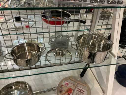 Waaronder 5x kookpot met deksel en 1 braadpan en 1 pannenkoekenpan met verdeler