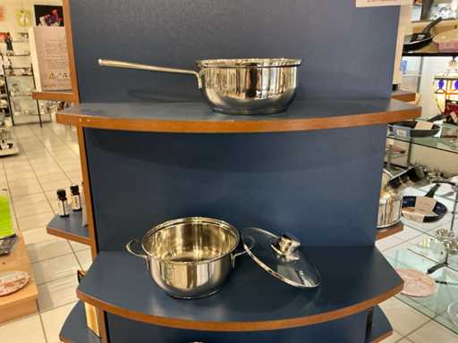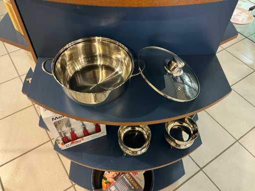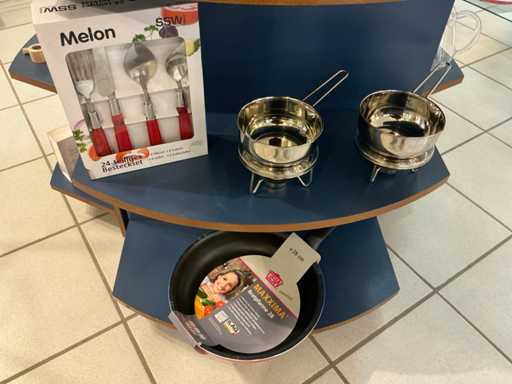 3 delig kookpotset bestaande uit 2 x kookpot in diverse diameters met deksel en steelpan, 1 x 24 delig bestek voor 6 personen Melon,1 x braadpan 28 cm, 2 x sauspannetjes met warmer