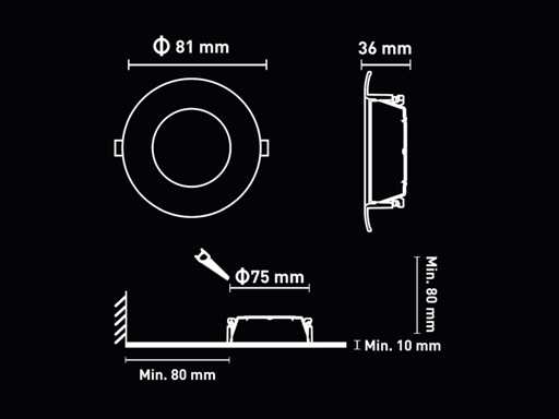 afdichting IP20, product kleur wit, afm. Ø 81 x 36mm, inbouwdiameter ø 75mm, materiaal ABS, fitting GU10, inclusief aluminium anti verblinding honingraat filter 50mm allen geschikt voor GU10 met lens, inclusief keramiek lamphouder, lichtbron bulb niet inclusief, geschikt voor binnen, een bulb invoer, voltage 220-240V, SKU 1164 SKU353 Sku 1165