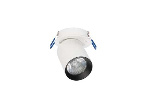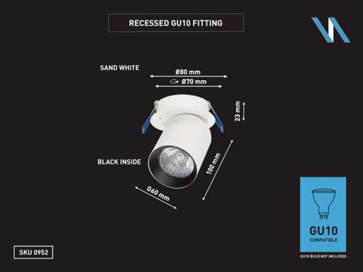 afdichting IP20, product kleur zand wit en zwart ring, afm. Ø 60 x 100mm, inbouwdiameter ø 70mm, draaibaar 350° en kantelbaar 50°, materiaal aluminum, bevestiging inclusief, fitting GU10, bulb niet inbegrepen, geschikt voor binnen, een bulb invoer, voltage 220-240V, max 40 watt, SKU 00952
