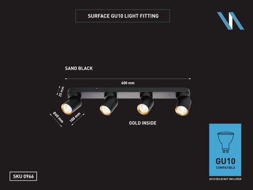 afdichting IP20, product kleur zand zwart en goud ring, afm. Ø 60 x 100mm, afm wandhouder 600 x 60 x 25mm, draaibaar 350° en kantelbaar 50°, materiaal aluminum en ijzer, bevestiging inclusief, fitting GU10, bulb niet inbegrepen, geschikt voor binnen, 4 x bulb invoer, voltage 220-240V, max 40 watt, SKU 00966