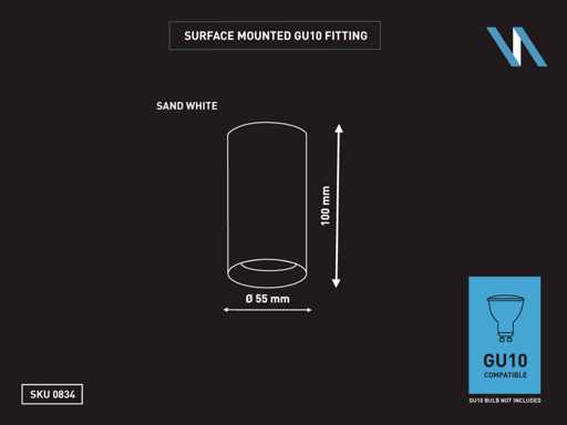 afdichting IP20, product kleur zand wit, afm. Ø 55 x 100mm, bevestiging inclusief, materiaal aluminium, fitting GU10, bulb niet inbegrepen, geschikt voor binnen, een bulb invoer, voltage 220-240V, SKU 00834