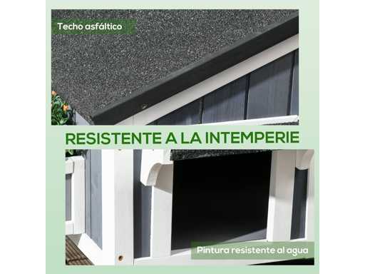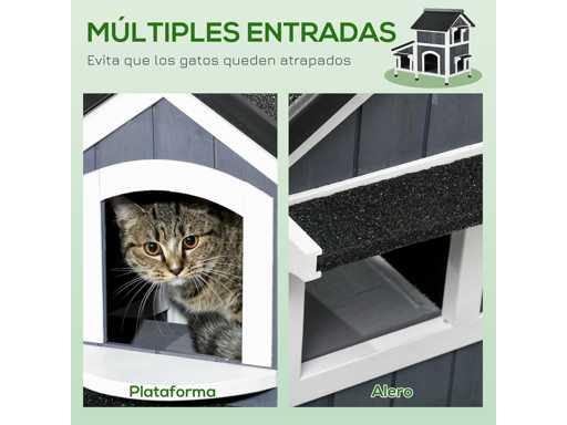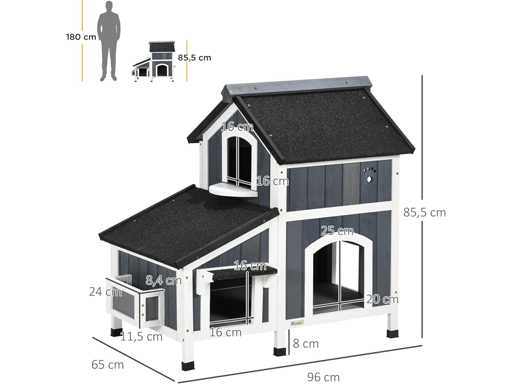 Meerdere leuke ingangen voor gemakkelijke toegang of uitgang Asfaltbedekking beschermt tegen regen en biedt schaduw Waterbestendige verf bij onverwacht weer Een schattige plantenbak om planten te kweken, zoals kattenkruid Boven de grond verheven, droog en beschermd tegen vocht op de vloer Geschikt voor katten tot 7 kg Montage vereist Kleur: grijs, wit, groen Materialen: Sparren Totale afmetingen: 96 x 65 x 85,5 cm Binnenafmetingen van het hoofdgebouw Bovenkant: 47 x 50 x 35 cm Interne afmetingen: Onder: 80 x 50 x 34 cm Binnenste gatmaat 16 x 16 cm Deuropeningsmaat 20 x 25 cm (L x B x H) Plantenbakkenafmetingen: 24 x 8,4 x 11,5 cm Van de grond 8 cm