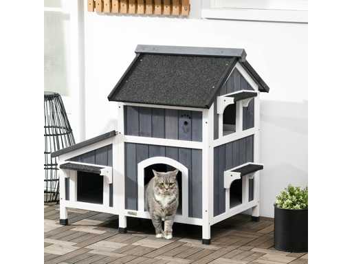 Houten kattenhuis met bloempot, ramen, meerdere ingangen