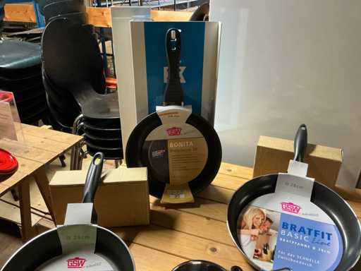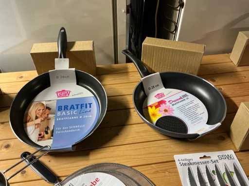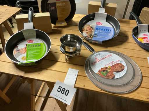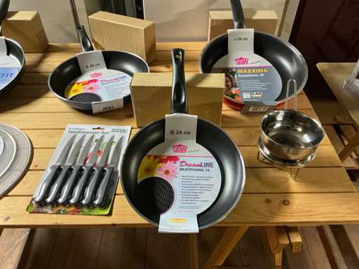 6 braadpannen met antikleef in diverse maten, antispatdeksels, messenset, sauspotjes met warmer...