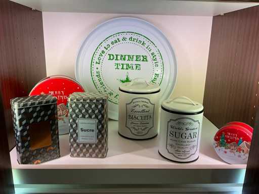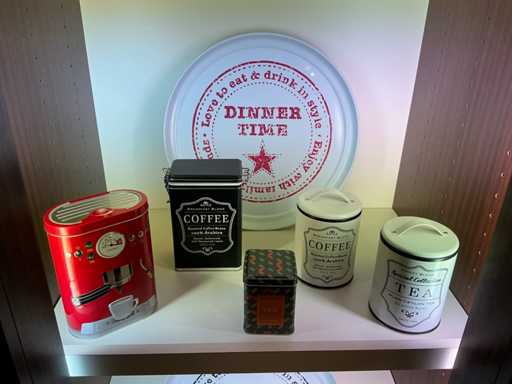 Waaronder 4x dienblad, diverse vintage opbergdozen ,suikerdozen, koekjesdozen, koffiedozen....