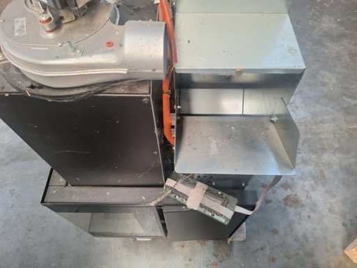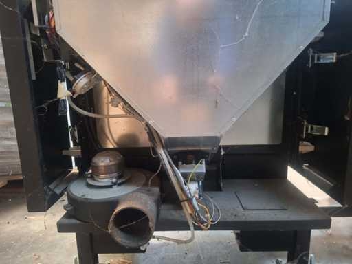 - Pelletkachel hoekhaard linkerzijde met grote dubbele verbranding pot voor groot vuur, dubbele gesloten ventilator en uitgang rookafvoer van 100mm.