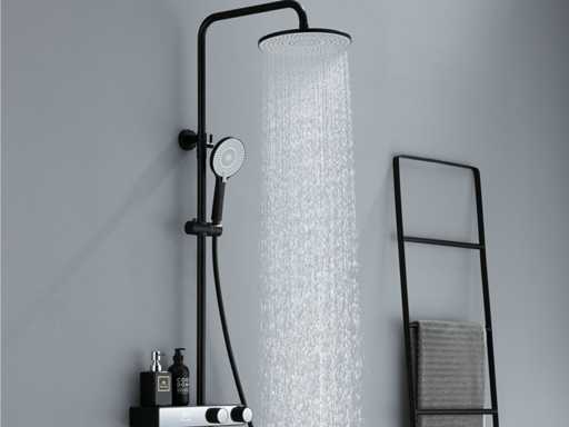De doucheset is uitgerust met drie functies. Hoofddouche, handdouche en de baduitloop worden afzonderlijk van elkaar gebruikt. Door de aanwezigheid van de baduitloop is deze doucheset uitermate geschikt voor douchebaden. Naast deze drie functies is de doucheset uitgerust met een digitaal display waarop je in een oogopslag de temperatuur van het water en de gebruiksduur kunt aflezen. Daarnaast word er gebruik gemaakt van keramische binnenwerken zodat je jarenlang plezier zult hebben van jouw regendoucheset. Doordat de doucheset in hoogte verstelbaar is past hij in vrijwel elke badkamer! Hoogte: van circa 80 tot 125cm verstelbaar. Materiaal: messing. Kleur: Mat Zwart. Binnenwerk: keramisch. Douchekop: Rond kantel/draaibaar van abs. Handdouche: verstelbaar met doucheslang (abs). Voorzien van: digitale micromotor aansturing door middel van waterflow. Geen stroom nodig. Temperatuur en tijdsduur digitaal afleesbaar. Keramisch binnenwerk goed voor 800.000 keer open/dicht zonder lekkage. Plaatdikte: 12 UM, werkdruk: 2-12 kgf/cm2. Werking temperatuur: 0 tot 90 graden Celsius. Anti kalk behandeld. Badkraan uitloop. Bijzonderheden: h.o.h. afstand van 150 mm.